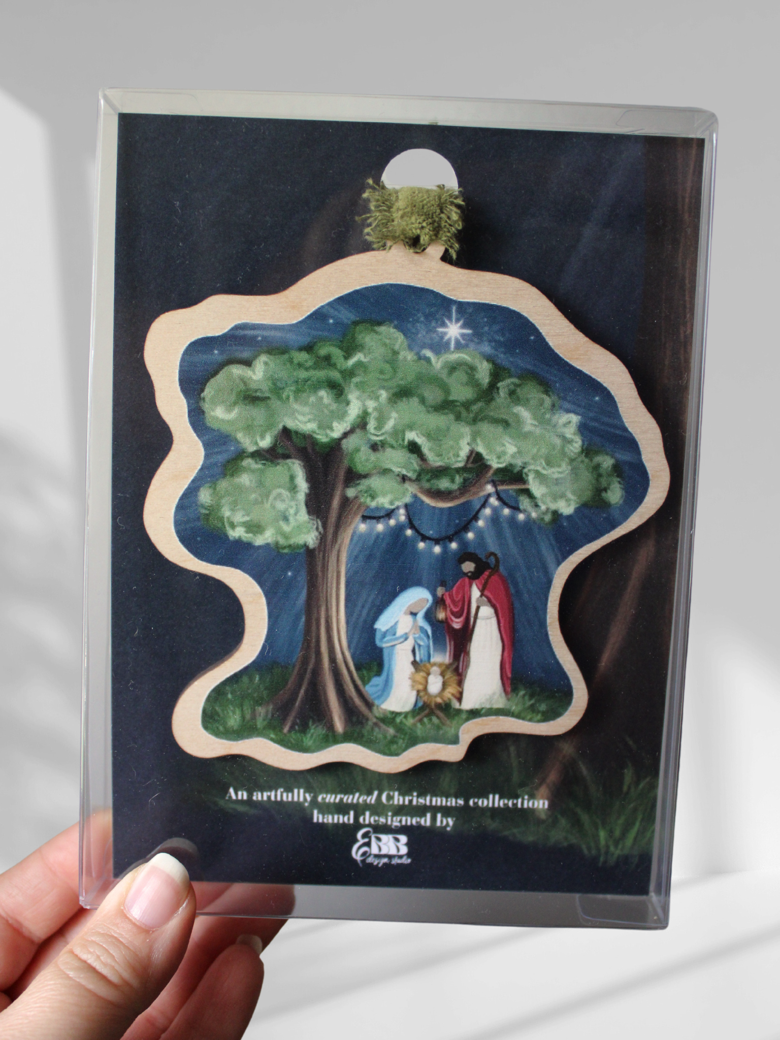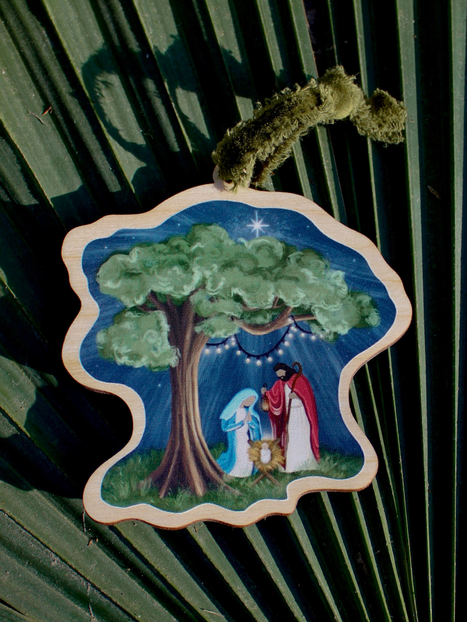 Experience the warmth and unique charm of a Louisiana Christmas with this handcrafted wooden nativity ornament designed at EBB Design Studio. This custom Christmas ornament captures the essence of the Louisiana bayou, with its beautiful oak trees and swampy grassland. Complete with a frayed mossy green velvet ribbon, this piece is part of a curated collection that will bring a personal touch to your holiday decor.