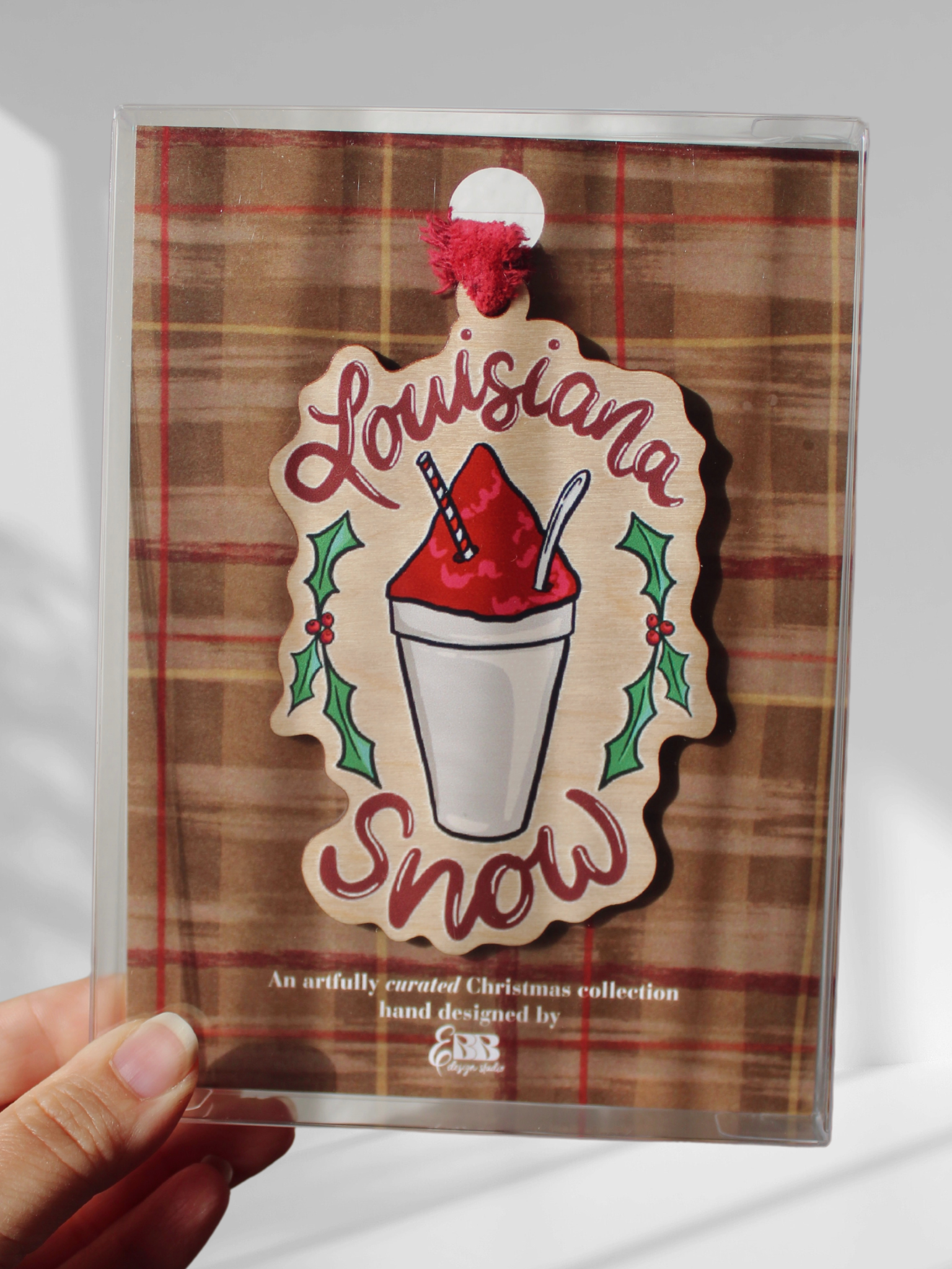 Bring a touch of Deep Southern Louisiana Charm to your holiday decor with this "Louisiana Snow" wooden ornament, featuring the infamous Tigers Blood snoball flavor. Hand designed and printed on high quality wood. Featuring a festive snowball treat and holly accents, adorned in a red frayed velvet ribbon, the perfect addition to your Louisiana Christmas tree.