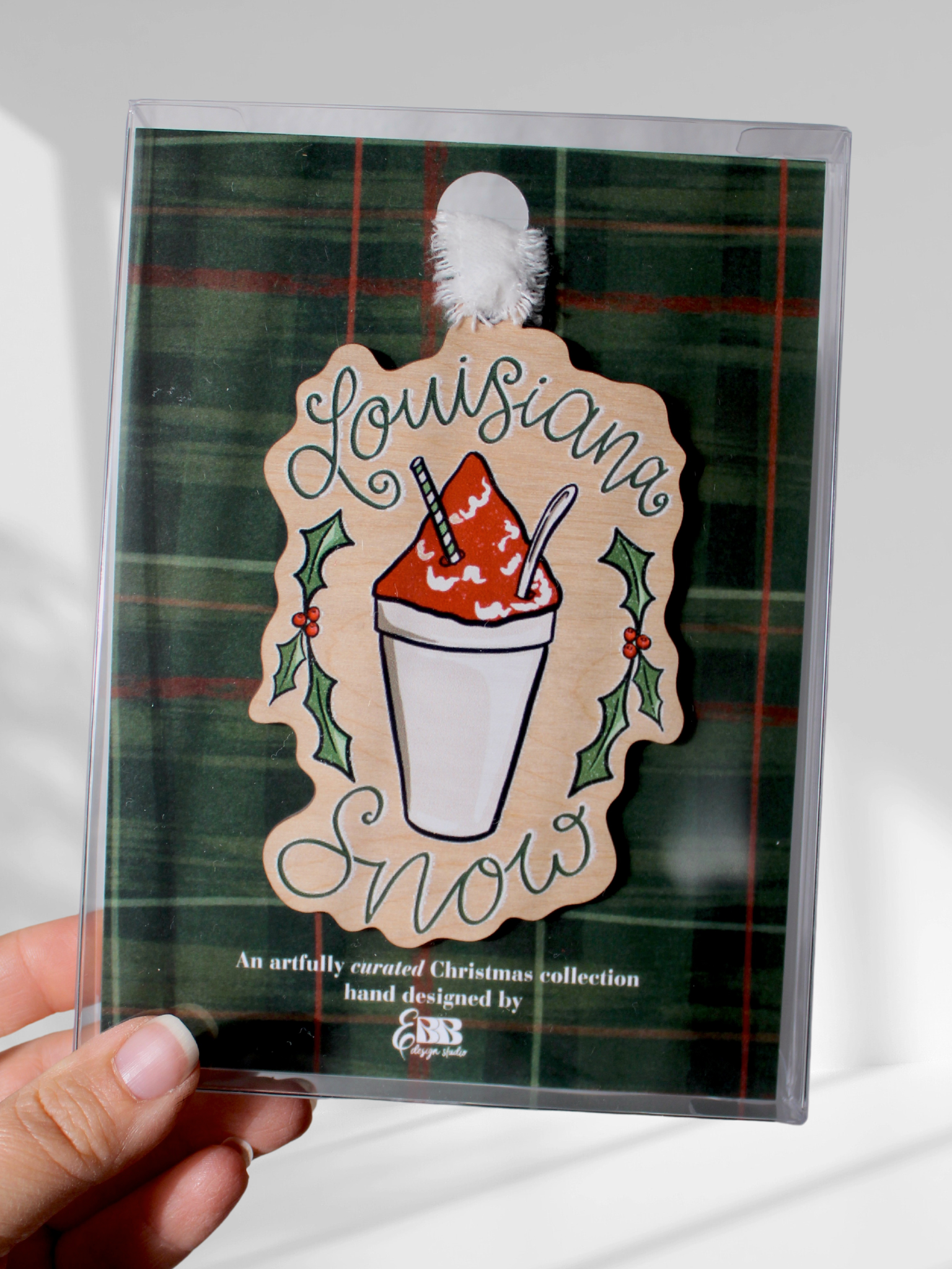 Beat the Louisiana heat with this southern charm "Louisiana Snow" ornament. Featuring the souths favorite year around treat, aka the infamous Louisiana snoball. Printed on high quality birch wood which is also shatterproof. Featuring a festive snowball treat and holly accents, adorned in a white frayed velvet ribbon.