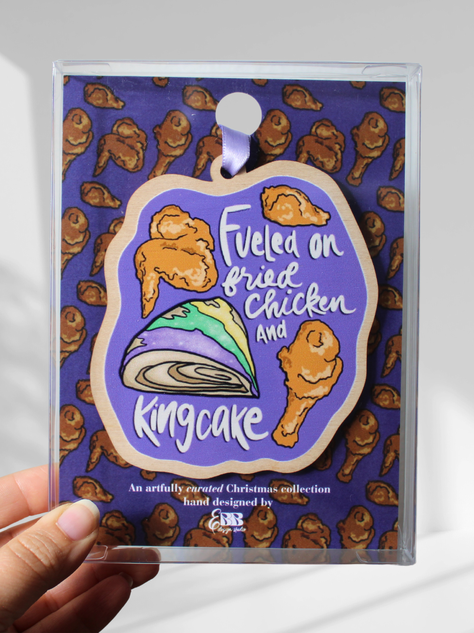 Add some holiday charm to your tree with this beautifully-designed wooden Mardi Gras ornament, showcasing a hot Louisiana fried chicken and a slice of King Cake. The tradition has is that natives of Louisiana eat fried chicken and king cake every Mardi Gras. This joyful ornament is complete with a luxury satin lavender ribbon, this piece is part of a curated collection that will bring a personal touch of NOLA to your holiday decor. Designed by EBB Design Studio.