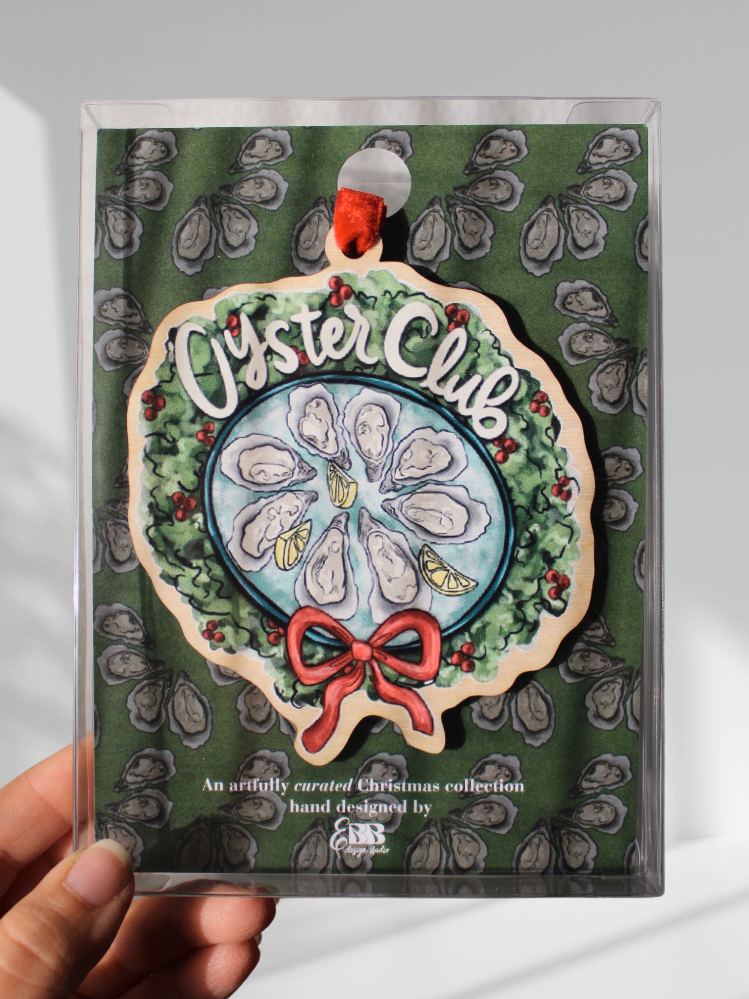 Add some holiday charm to your tree with this beautifully-designed wood ornament, showcasing a platter of raw Louisiana oysters and Oyster Club written above. Complete with a luxury red velvet ribbon, this piece is part of a curated collection that will bring a personal touch of NOLA to your holiday decor.