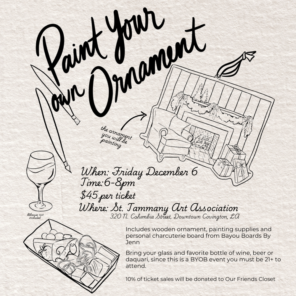 Experience the joy of the holiday season by joining our Christmas ornament painting class! Your ticket includes a beautifully hand-designed ornament, along with all necessary painting supplies. Enjoy a personal charcuterie board from Bayou Boards by Jenn while you create. And don't forget to bring your favorite drink and glass to complete the holiday experience! Since this is a BYOB event, must be 21+ to attend.